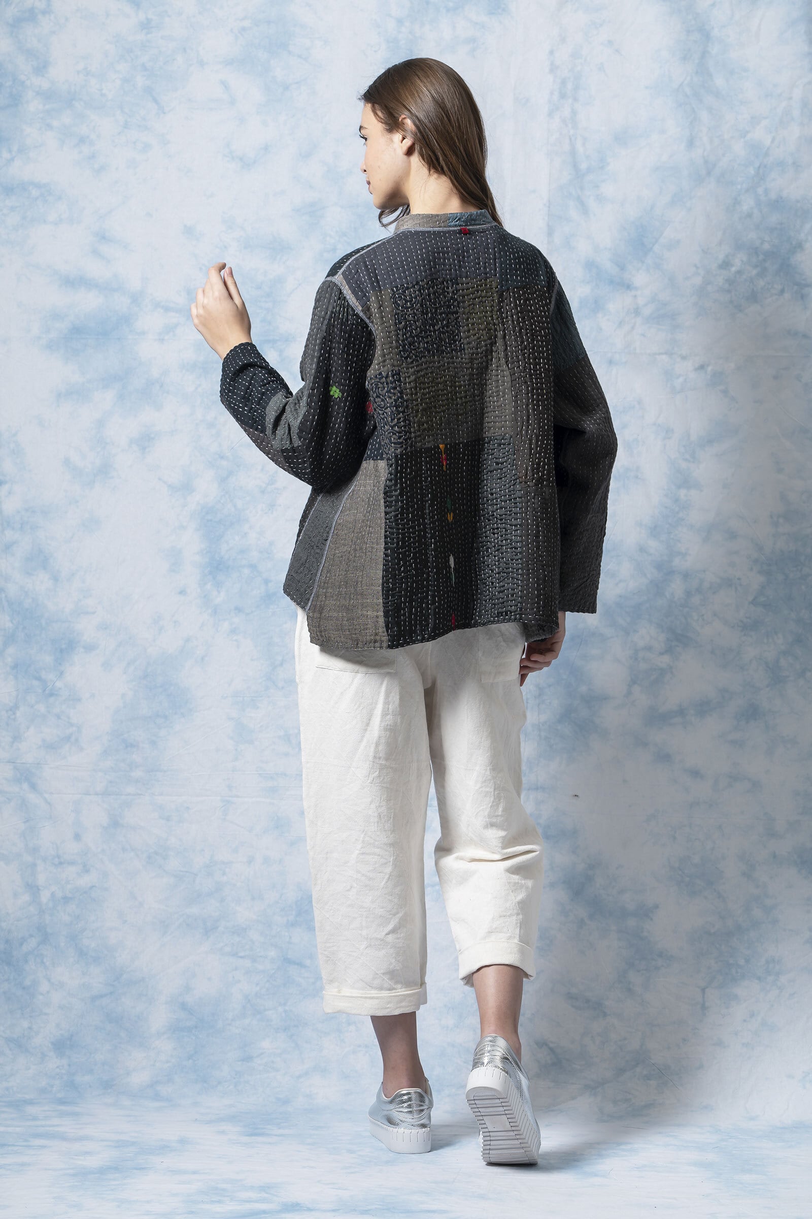 ヴィンテージサリーを幾重にも重ね、細やかな手縫いのカンタステッチで仕立てた一着。