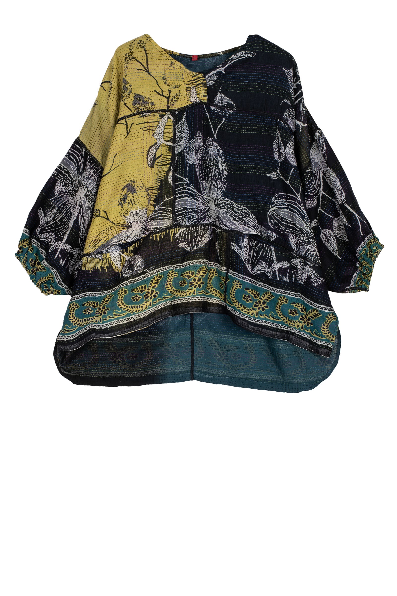 カンタとはインドの民族衣装のサリーの生地を幾重にも重ねて刺し子を施した布(カンタ刺繍)のことです。〈ミエコミンツ〉の洋服やアクセサリーは全てオリジナルカンタで作っています。